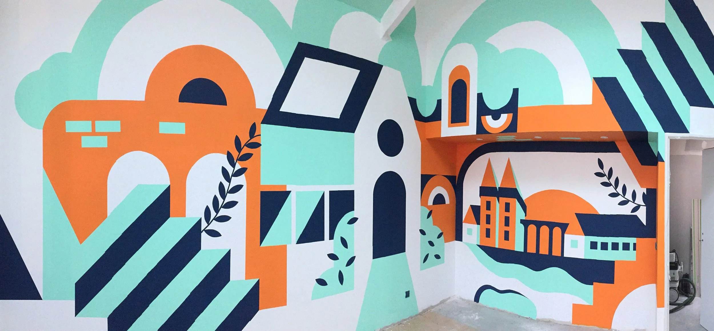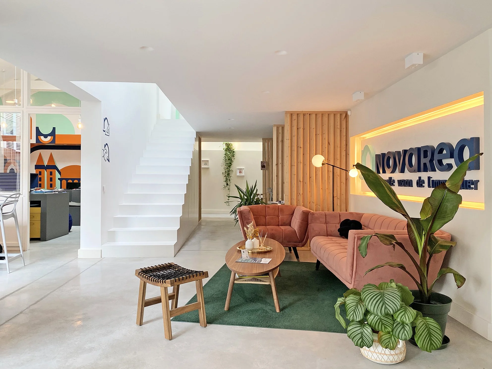 Novarea PauClient : Novarea Novarea est une agence immobilière du Sud Ouest, à Pau, Lons et Hossegor. L’agence propose une nouvelle vision de l’immobilier.Création et réalisation d’une fresque murale à partir de la charte graphique du groupe sur leur agence de Pau.